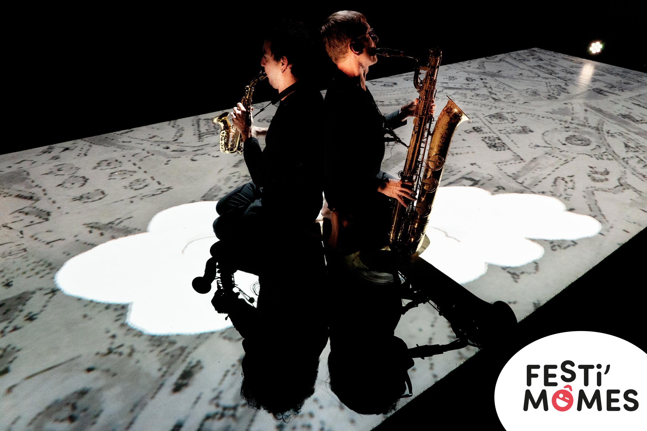 Un livre musical ouvert aux pieds des enfants et des plus grands. Sopryton ? Quel drôle de nom ! Il vient de la rencontre d’un saxophone soprano et d’un saxophone baryton. Deux musiciens jouent de la différence sonore pour créer de surprenants tableaux musicaux. Pendant que le soprano barytonise et que le baryton sopranise, des projections au sol dessinent les contours d’un livre musical ouvert aux pieds des enfants et des plus grands. Face à une si belle complicité, on n’hésite pas un instant à plonger dans cette bulle sonore et visuelle, aussi magique que poétique.